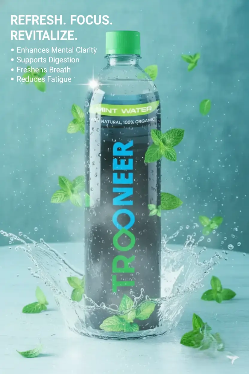 Mint Water is a refreshing functional drink enriched with the natural benefits of mint leaves, known for supporting digestion, mental clarity, and immunity. Menthol present in mint helps soothe the digestive system, improve focus, and reduce stress, making it an excellent hydration choice for daily wellness.